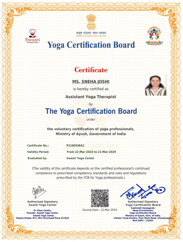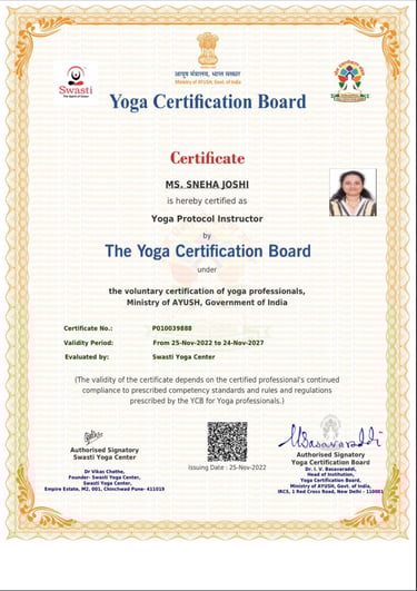 In pursuit of my love for yoga, I dedicated myself to expanding my knowledge and honing my skills. Last year, I successfully completed a comprehensive yoga teacher training program and received certification from Ayush Yoga Mantralaya, Government of India, Delhi. This formal training not only deepened my understanding of yoga but also equipped me with the necessary tools to share its transformative power with others.