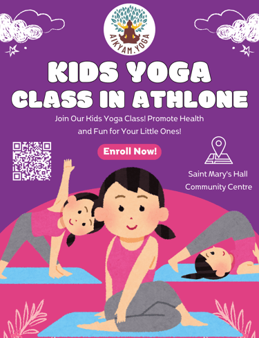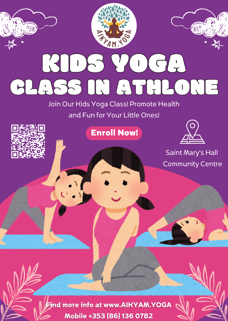 Ignite your child’s imagination and well-being with our fun-filled kids yoga class, running from 14th July to 25th August, every Monday from 6–7 PM at St. Mary’s Hall, Athlone.